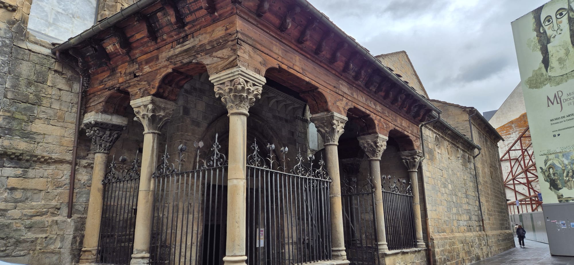 El TEMPLO CATEDRALICIO conserva en lo básico su estructura y configuración románica: una planta basilical de tres naves de cinco tramos con sus correspondientes ábsides alineados y dos puertas de acceso: la plaza de San Pedro (donde antiguamente se situaba el monasterio homónimo), y la puerta meridional, desde el siglo XVI dotada también de lonja y vinculada a la plaza del Mercado. De los tres ábsides románicos sólo el meridional o de la Epístola se conserva inalterado, pues su simétrico quedó destruido y el central fue ampliado a finales del siglo XVIII para evitar las humedades de un cementerio anejo a la cabecera y para poder trasladar al presbiterio el coro y el órgano que estaban situados desde antiguo en los pies de la nave central (este traslado no se haría efectivo hasta 1919).