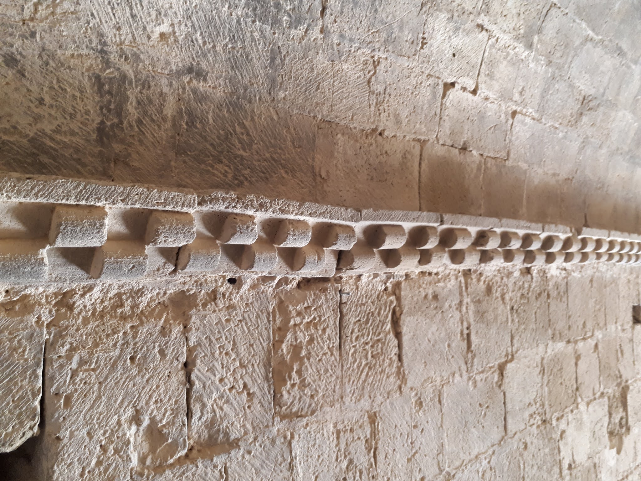 En el INTERIOR, las tres naves están separadas por arquerías de medio punto que apoyan sobre pilares cruciformes y cilíndricos que se alternan, configurando un curioso «tramo doble» del que pueden encontrarse paralelismos en iglesias del norte de Francia y en Inglaterra. Los capiteles, con una configuración básica de orden corintio, presentan diversos tipos de decoración: geométrica, vegetal y figurada.